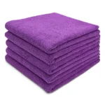 Our purple microfiber towels are made from premium synthetic fibers. The fabric is soft, highly absorbent, and quick-drying. It performs well in high-traffic environments and maintains its vibrant color over many washes. The quality of the material ensures that each towel is both effective and durable. Guests and housekeeping teams appreciate the luxurious feel and performance of our product.